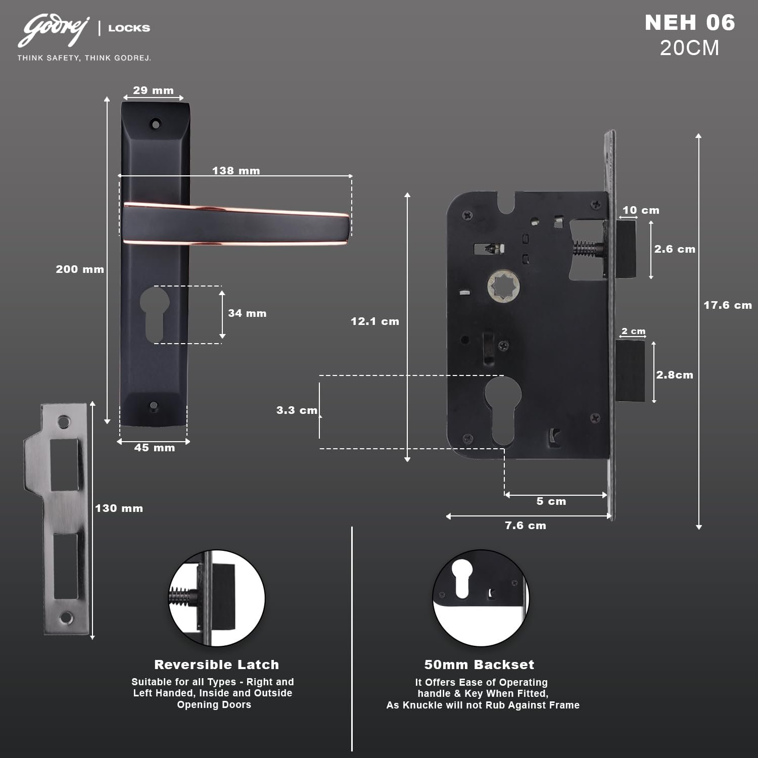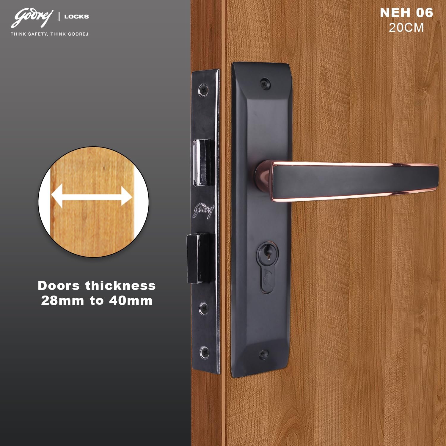 - COMBI SET : The Godrej mortise door lock (NEH 06) is a fantastic combination of door handle, lock body & Euro profile cylinder offering highest usability and optimum safety.
